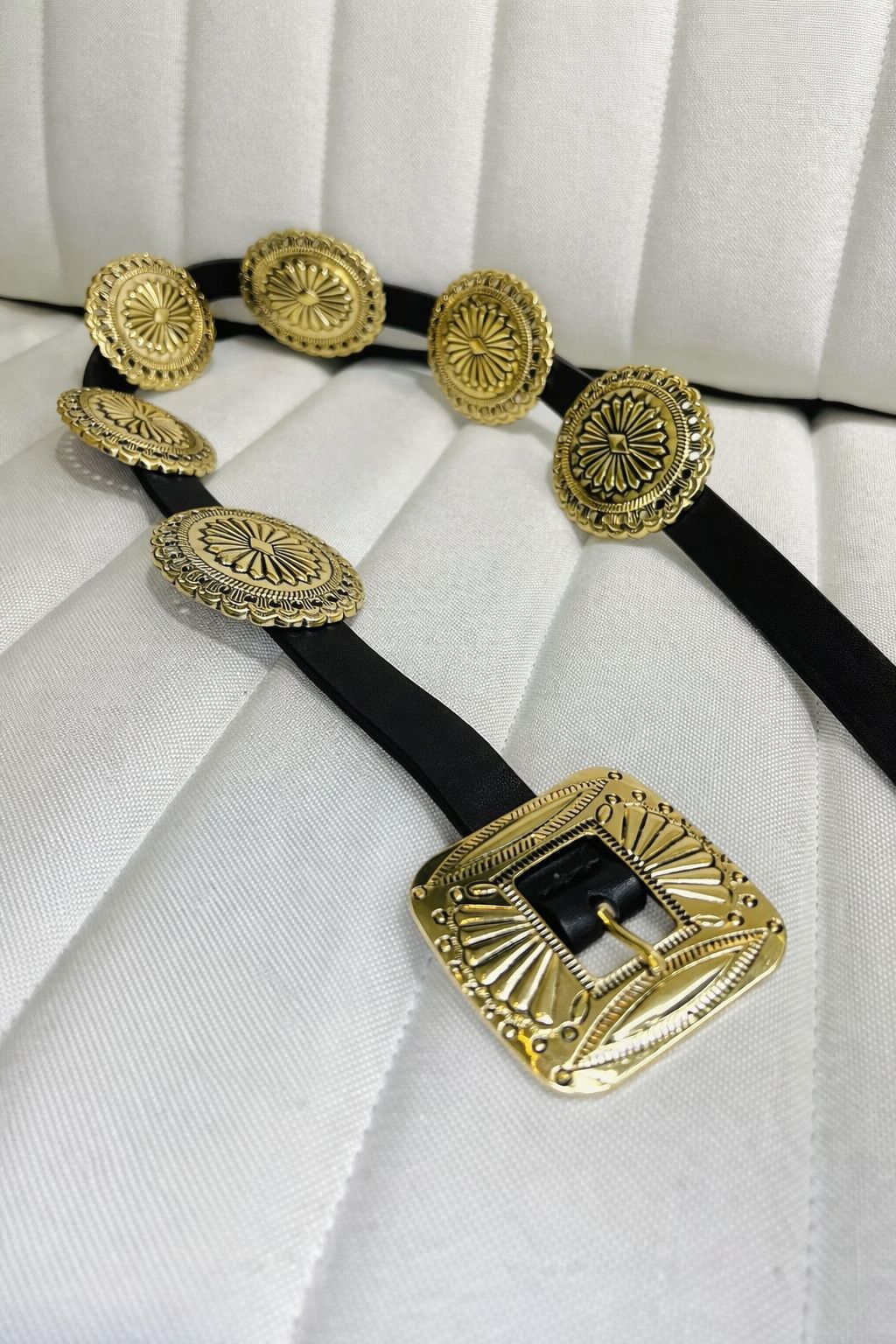 Tamanho Único 110 cm, detalhes ao longo do comprimento. A largura da base é de 2 cm, com fivelas decorativas que medem 6 cm de largura.Comprimento da Fivela 6 cm Largura da Fivela 6 cm