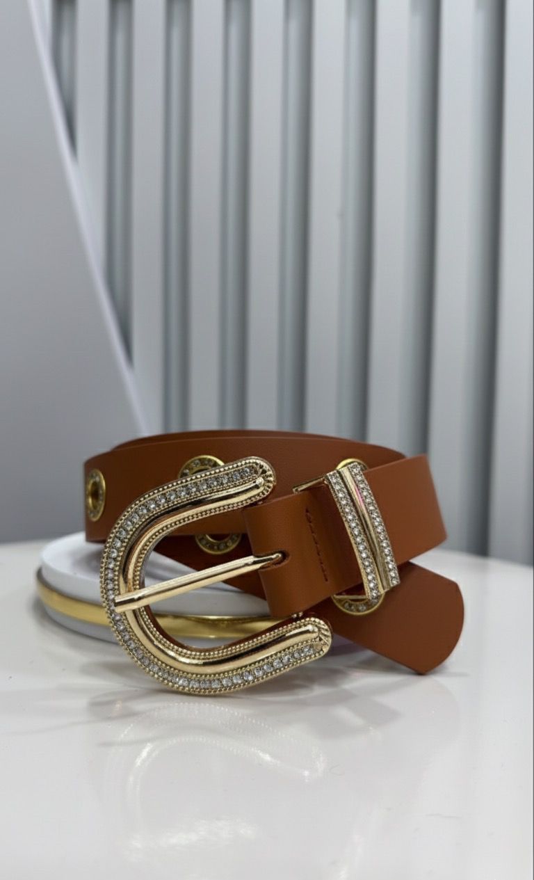 Cinto Marrom Ilhós e Fivela Strass Dourado