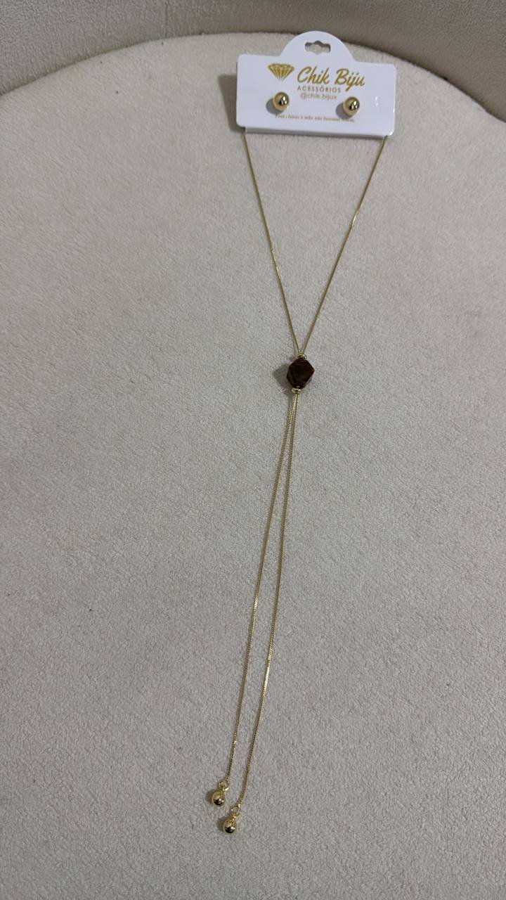 Conjunto De Colar Gravatinha + Brincos Dourado Com Marrom
